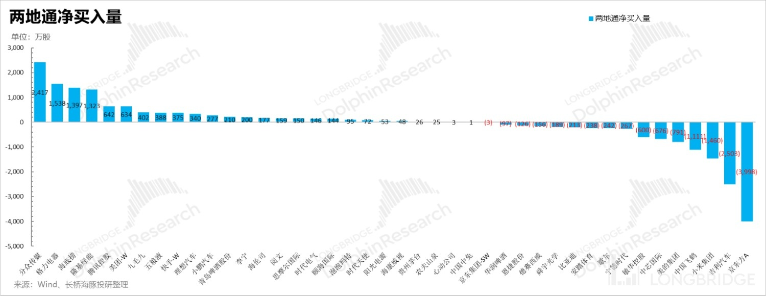 从海豚君票池内个股的南北资金流向来看,上周 28、29、30 号三天时间,买入较多的仍然偏消费龙头和互联网公司,卖出较多的仍偏科技,如小米和京东方,另外吉利汽车也再卖出榜上。