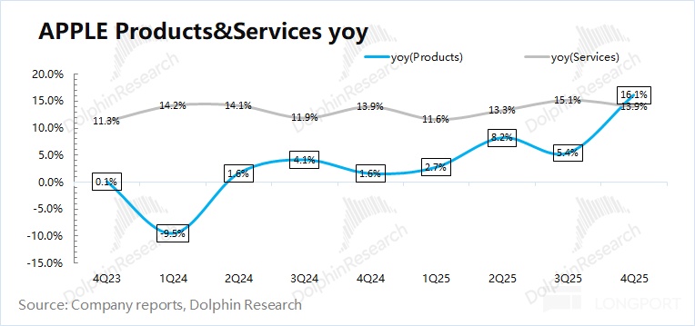 3、iPhone 以外其他硬件:公司本季度 iPad 业务实现 6.3% 的同比增长,主要得益于 M5 Pro、A16 机型增长的带动;而 Mac 及其他硬件业务本季度出现了下滑,其中 Mac 受去年 M4 机型热销的高基数影响、而其他硬件的整体需求仍相对较弱。