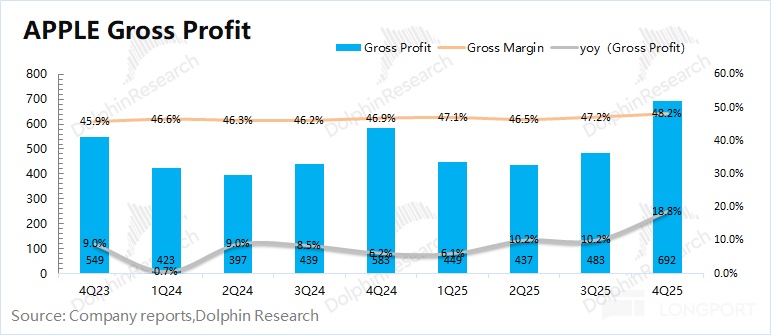 2、iPhone:$苹果(AAPL.US) 本季度 iPhone 业务实现营收 853 亿美元,同比增长 23.3%,远好于市场预期(782 亿美元)。本季度手机业务的增长,受 iPhone17 系列新品和美元贬值的影响。对于本季度,海豚君估算 iPhone 整体出货量同比增长 5.7%,出货均价同比上涨 16.7%。