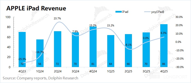 2026 财年第一季度(即 4Q25)iPad 业务收入 86 亿美元,同比增长 6.3%,略好于市场一致预期(82 亿美元),主要得益于 M5 Pro、A16 机型增长的带动。