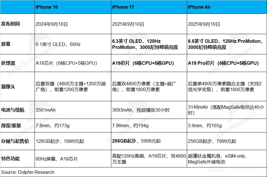 iPhone17 系列将存储统一升级至 256G 起步,但价格依然维持在 5999 元(符合中国大陆国补要求),这直接带动了 iPhone 在本季度中国大陆地区的出货量实现了将近 20% 的增长,远好于整体手机市场的表现(同比-0.8%)。