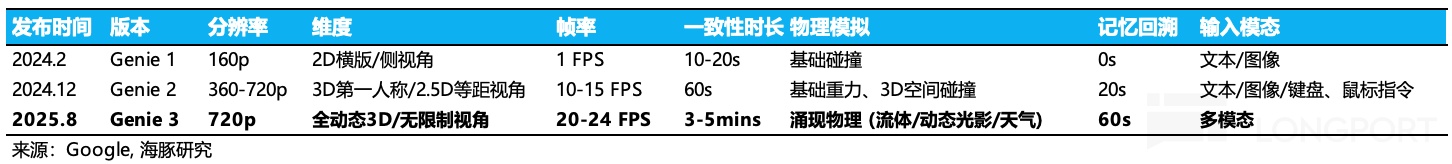 Genie 的初代版本实际应用空间有限,存在低分辨率、交互场景单一、一致性时效只有几秒、物理模拟限于简单碰撞等缺点。但 2024 年 12 月发布的第二代版本,将上述缺点进行显著弥补:分辨率提升,引入 3D 交互,一致性时效提高,增加更多的物理反馈等。