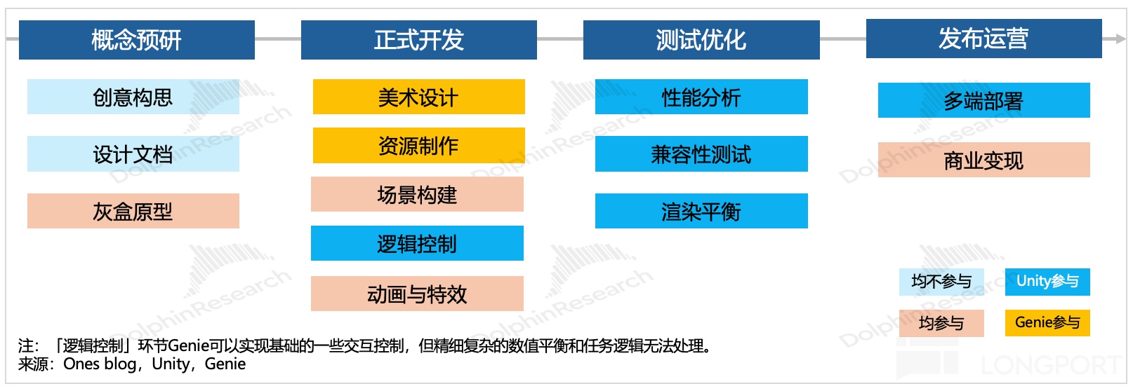 Unity 参与的部分就是预研环节的灰盒原型、正式生产中的多模态资产整合、场景构建中的布置、光影渲染等、逻辑控制中的物理模拟的精确计算以及编写代码实现逻辑控制(关卡任务系统、数值逻辑、UI 交互等),还包括最终测试优化、以及发布时一键生成多端版本。
