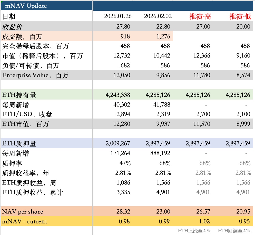 结论:若 ETH 反弹至 2.7k,mNAV 回升至 1,对应股价 27;若 ETH 跌至 2.1k,mNAV 跌至 0.95,对应股价 20,结论是极值区间为 20~27