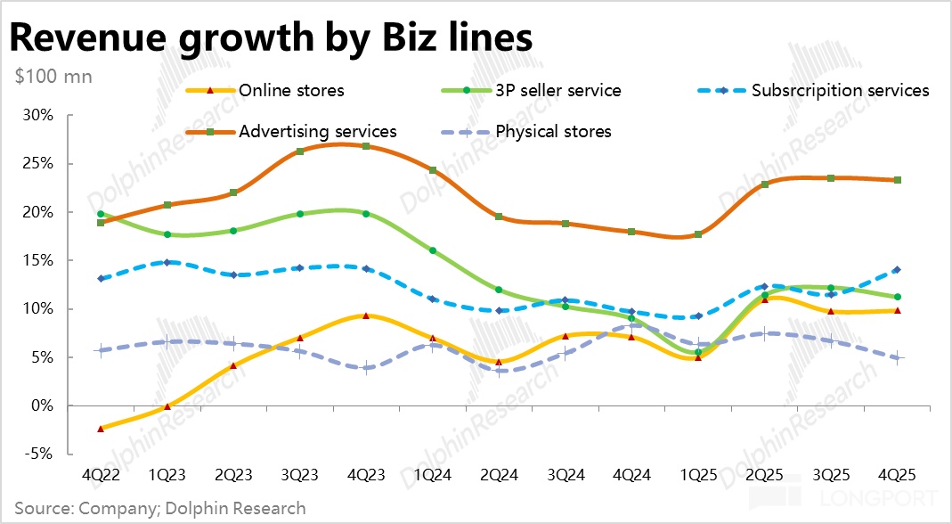 5、广告业务继续强劲增长:泛零售的细分业务线中,广告业务和订阅业务是本季比较亮眼的两个板块。