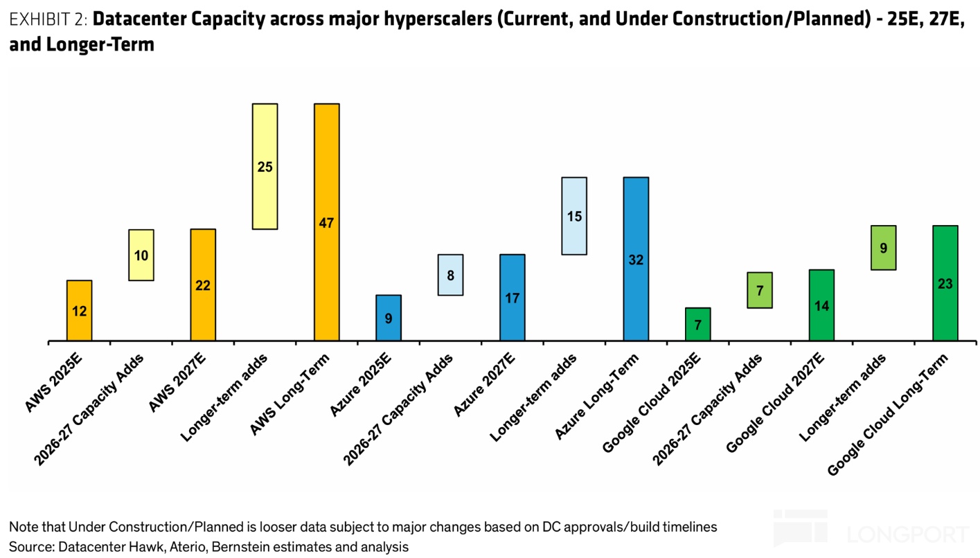 结合公司披露,AWS 会是未来 2 年内,新增算力供应最多的云服务商。按此前到 27 年算力翻倍的指引,预期未来 2 年 AWS 会合计新增约 10 GW 算力,而 Azure 和 GCP 则会在 7~8 GW 左右。