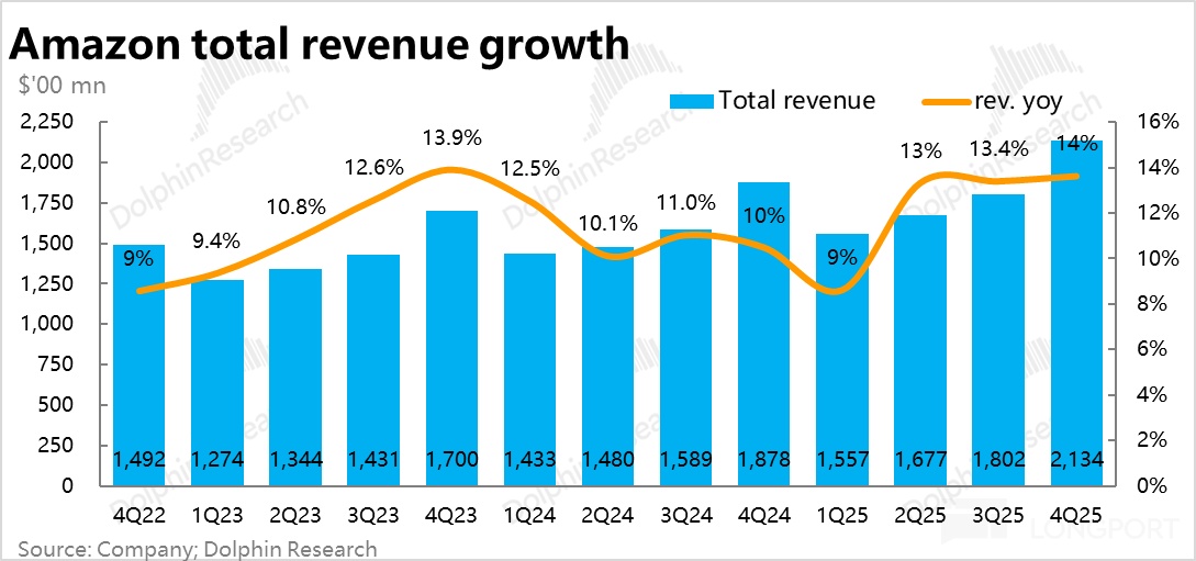 合计所有业务,亚马逊本季整体收入 2134 亿,同比增长 13.6%,小幅加速并略高于市场预期。剔除汇率利好,则实际增速大体环比持平在 12%。