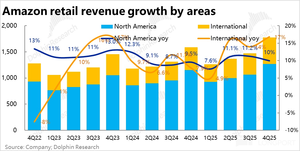 分地区看,北美零售收入增速为 10%,比上季放缓了 1.3pct。考虑到美国行业整体的无门店零售增长并没有明显变差, AI 似乎是开始对亚马逊的电商有一些轻微的竞争影响。