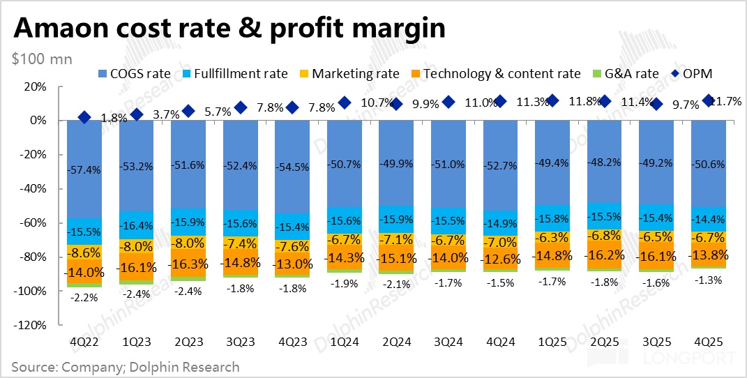 最关键的业务--AWS 的增速也如期有近 4pct 的明显提速,虽市场已有充分的预期,实际表现也还是小幅 beat。传统泛零售业务,虽不算亮眼,但至少增长稳健,利润率也在继续提升。因此,单看本季表现,确实并挑不出多少毛病。