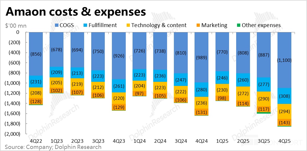 由于 AWS 的员工薪酬、研发成本、部分设备成本,以及流媒体内容的制作成本记在此费用项目中,可见这些业务上的投入力度较大。