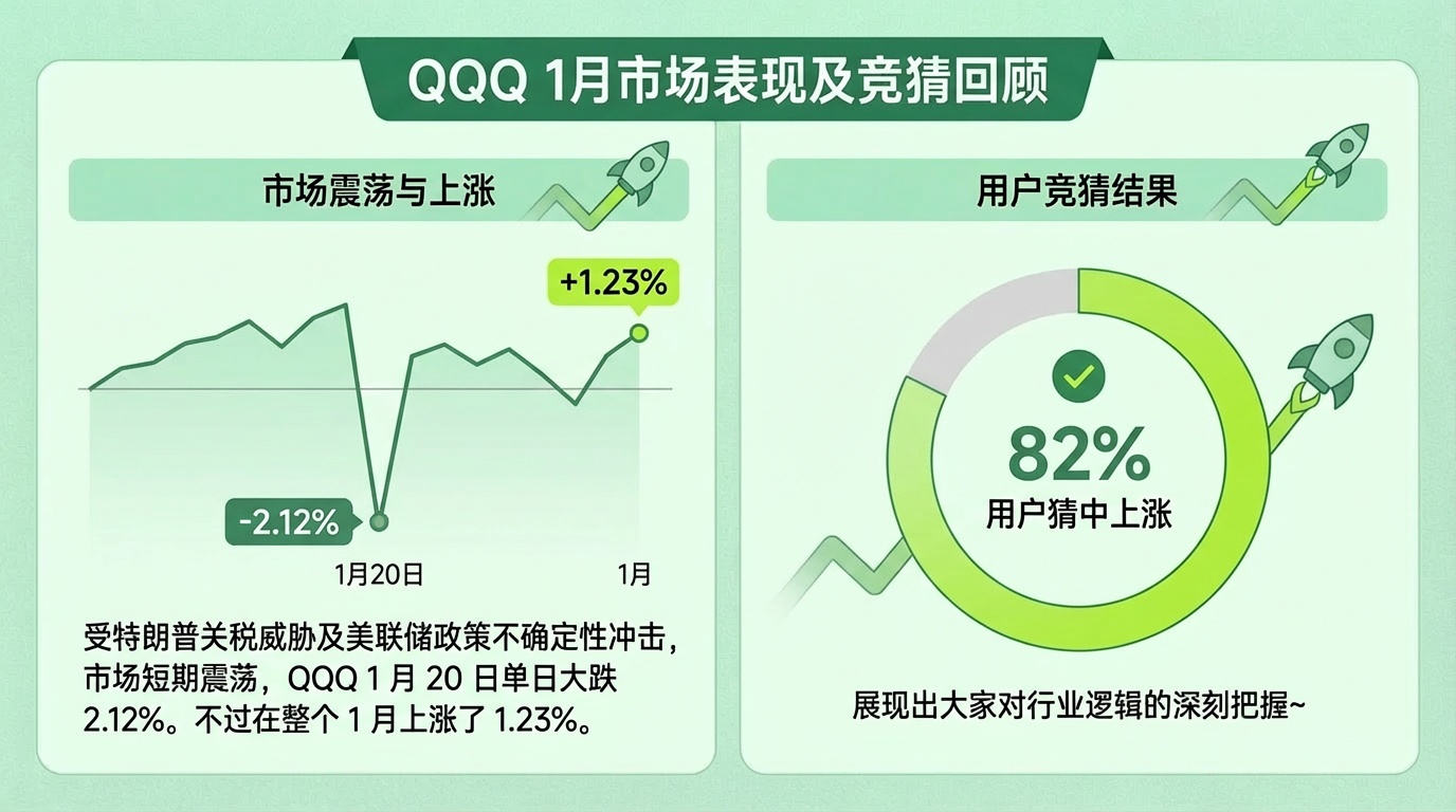 受特朗普关税威胁及美联储政策不确定性冲击,市场短期震荡,QQQ 1 月 20 日单日大跌 2.12%。不过在整个 1 月上涨了 1.23%。在其月涨跌幅竞猜中,82% 用户准确判断了 QQQ 在本月会上涨,展现出大家对行业逻辑的深刻把握~