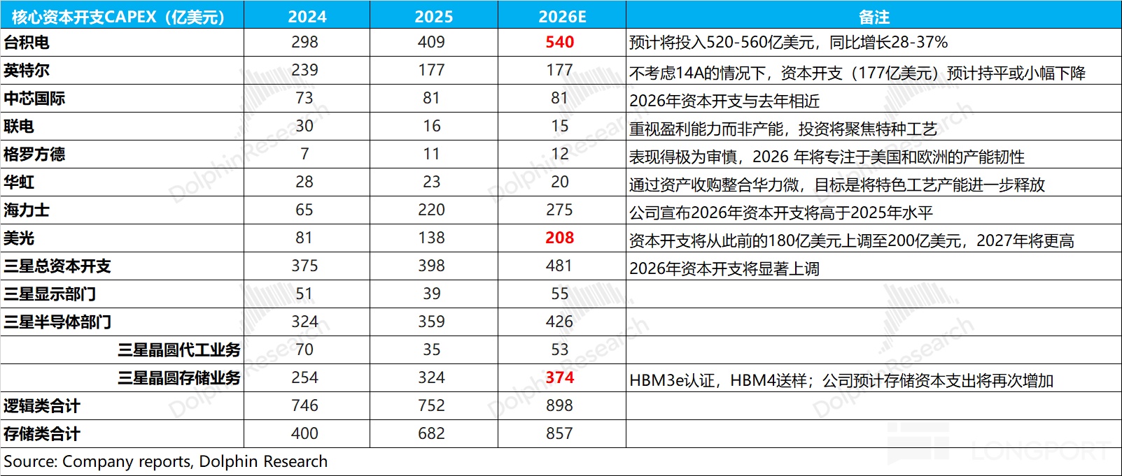 结合各家的资本开支展望来看,2026 年全球核心晶圆厂的资本开支将保持 20% 以上的增长,其中主要增量来自于台积电的先进制程和存储厂商的扩产。