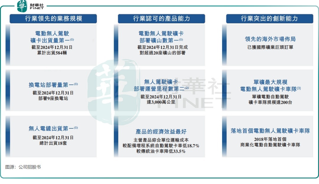 市场地位方面,根据灼识咨询数据,2024 年按出货量及收入计,伯镭科技已是全球最大的电动自动驾驶矿卡提供商;截至 2024 年底,其累计部署矿卡 584 辆,覆盖超过 20 座矿山,换电站部署量及无人电铲出货量均位居行业第一。
