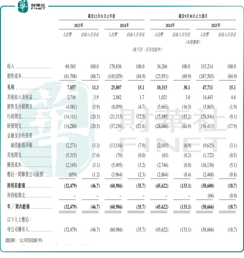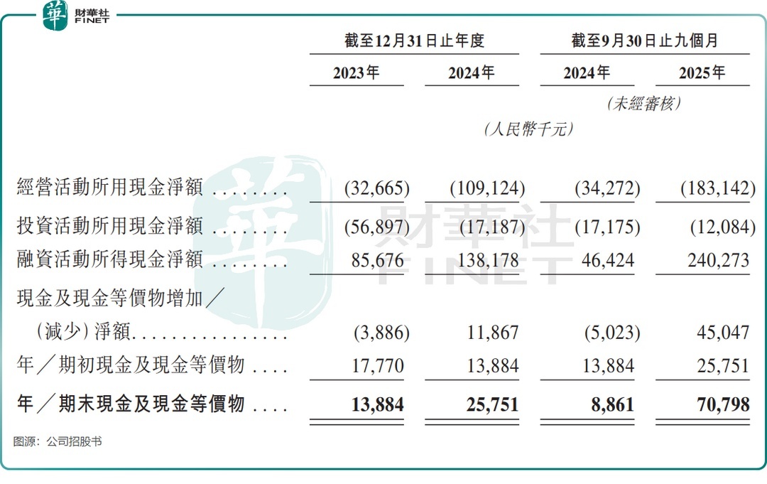 由于处于业务投入期,公司持续产生亏损,2023 年净亏损 3247.9 万元,2024 年扩大至 6098.6 万元,2025 年前三季度亏损 5866.6 万元。经营现金流同样承压,2025 年前三季度经营活动所用现金净额达 1.83 亿元,较上年同期大幅增加。