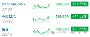 海致暗盘如果捞货还能吃到 210~240% 之间的肉!不过海致能首日这么坚挺也是外围市场表现不错的缘故,AI 应用股涨不少,还有一堆韩国佬下来抄货,看 MINMAX$MINIMAX-WP(00100.HK) 、智谱科技$智谱(02513.HK) 近几日表现,不少跌挺惨的票也跟踪拉了一波!