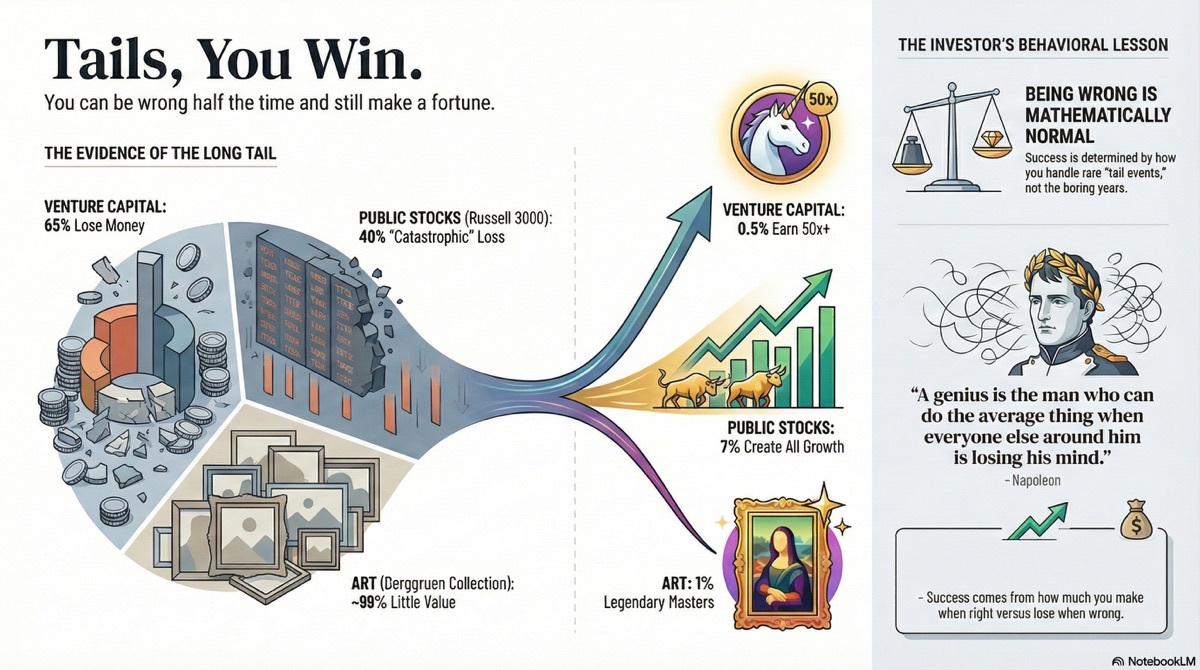 在商业和投资中,少数几个极端的 “尾部事件”(Tails)决定了结果。你不需要 400 个好点子,你只需要在那 400 次尝试中,哪怕只抓到一个《白雪公主》,就足够给所有的失败买单。