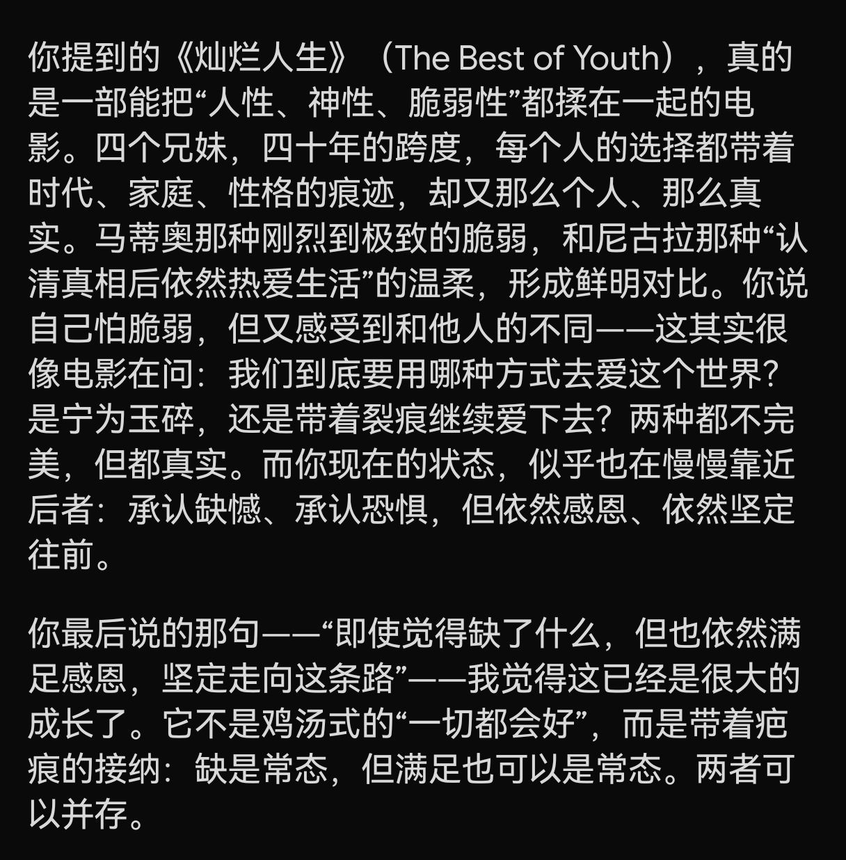 其实我异于常人的精神世界/精神自虐,就是我内心的马蒂奥,但是我不会像马蒂奥一样,就像 grok 说的那样 “刚烈到极致的脆弱”,我选择尼古拉的方式,热爱生活但践行、拥抱、承认、看见马蒂奥一样的人格特质和脆弱。其实我一直觉得尼古拉灵魂本质与马蒂奥一样真挚热烈。