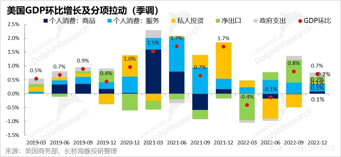 而整体上来看,由于衰退基本是预期内的事情,四季度 GDP 增长释放得最关键信息是,美国的经济增长看起来很有韧性,无论是商品消费的环比恢复,还是库存的意外增加,都说明了衰退虽然会到来,但很可能偏向于一个 “浅” 衰退。