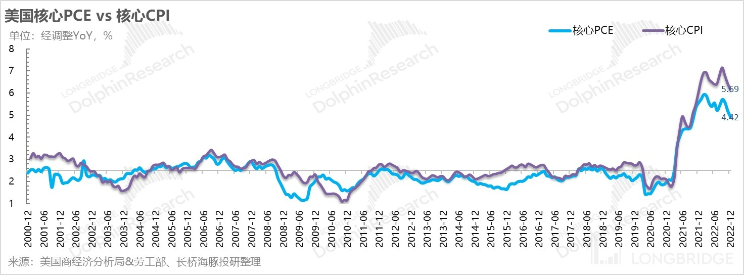 弱衰退预期的另外一个关键观测指标:当下经济未 “蔫掉” 而通胀已进入趋势性下行通道,因为在 12 月 CPI 超预期下行之后,服务消费权重高的 PCE 也在跟随 CPI 同步同频熄火,12 月核心 PCE 季调后同比是 4.4%。
