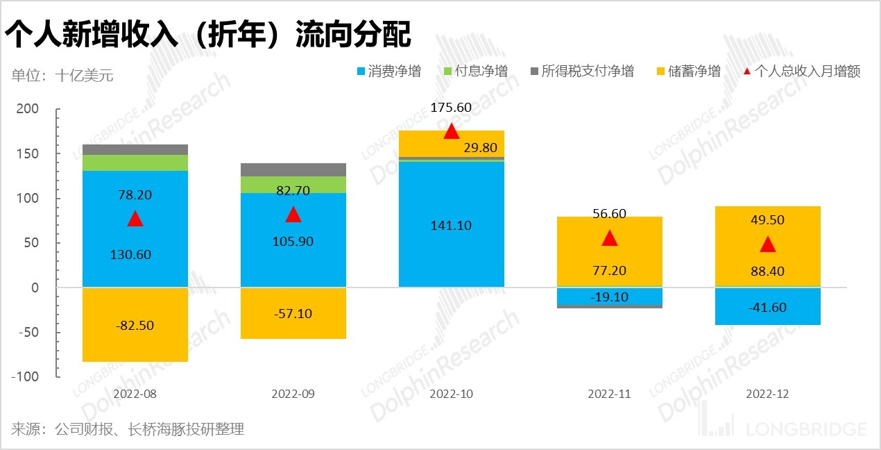 而且目前从居民收入的边际流向趋势来看,在储蓄耗到历史低位之后,美国人最近两个月每个月新增收入的分配上,开始重新往储蓄倾斜,而消费环比从 11 月开始,已经转为净减少。