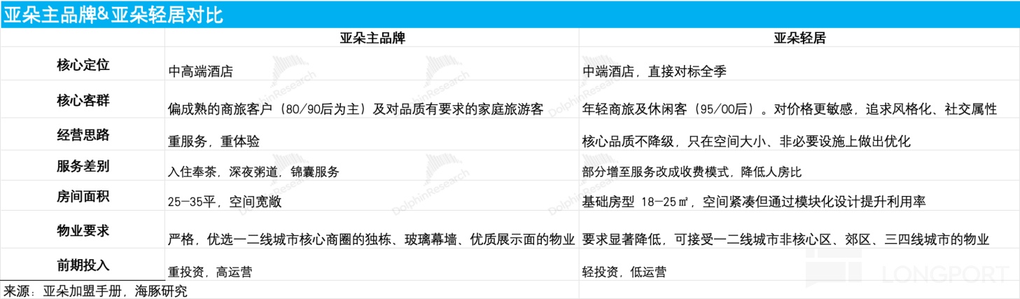 海豚君在下表做了对比,从中可以看到,相较于亚朵主品牌,轻居在睡眠体验(床垫、床品、枕头)、洗浴用品、服务基因等顾客的核心体验维度与主品牌均保持一致,只是在房间的空间大小、增值服务上进行了差异化精简,但品牌调性并没有发生实质性改变。