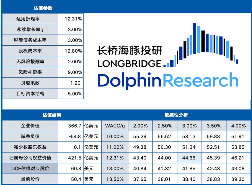 从绝对估值角度,假设 WACC=12.3%、永续增长率 3%,可以测算出亚朵中性预期下的 DCF 估值为 60 亿美元,较当前有 22% 的提升空间,两种情况下的估值基本相互验证。