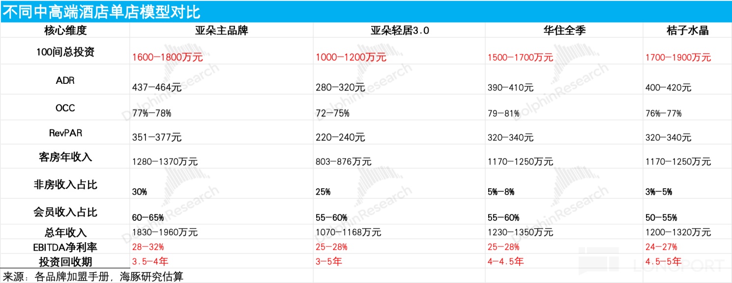 b:从加盟商的角度,海豚君在下图对比了当前市场上不同主流中高端酒店的单店模型,可以看到和华住旗下的全季相比,虽然亚朵的前期投入以及人房比要更高,但高品牌溢价带来的高 ADR,以及利润率更高的零售业务再加上更低的获客成本(亚朵酒店&零售业务会员体系深度打通,相互赋能,会员收入占比最高)使得亚朵最终的 EBITDA 利润率处于行业极高的水平,也带来了更短的投资回收期。(全季只有前期在核心地段开设的优质门店回本周期能和亚朵相当)