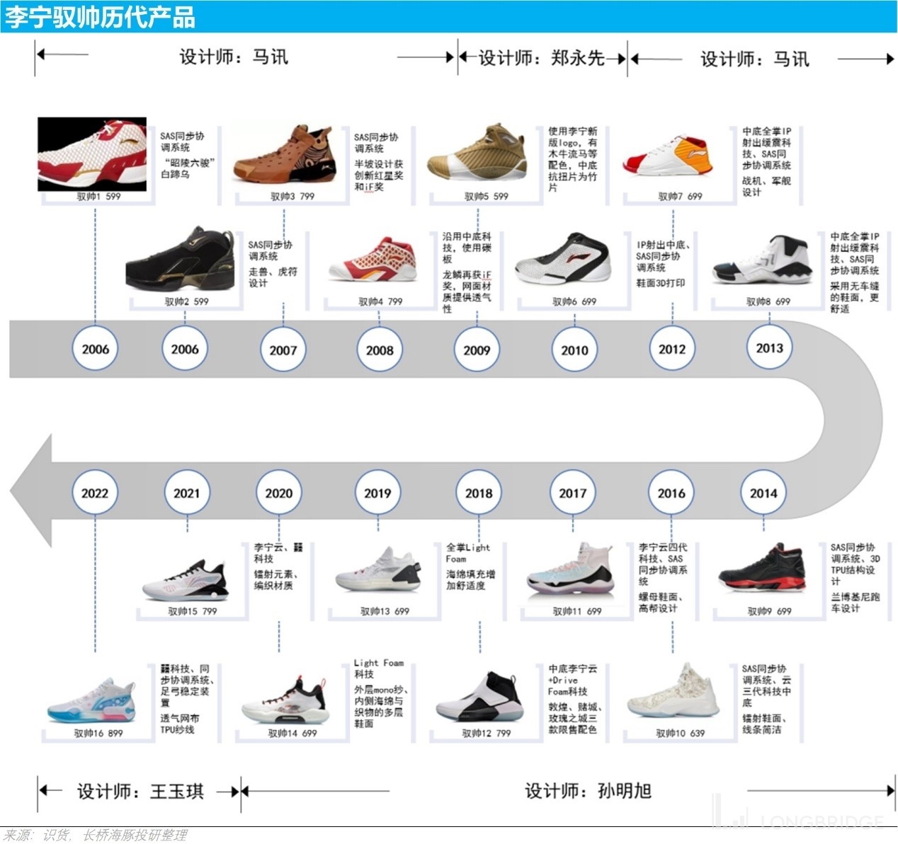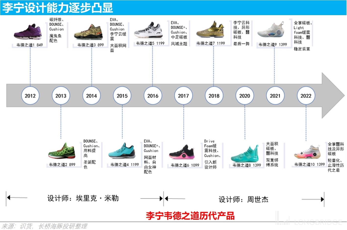 关于李宁的设计感,在篮球鞋这一块的表现尤为突出。过去十年,公司篮球类的产品在分品类流水占比当中从一成提成至近三成,这就不得不提到李宁的两大高端系列产品——韦德之道和驭帅。