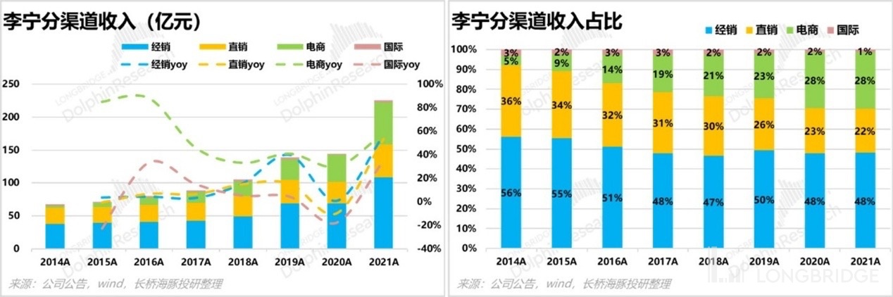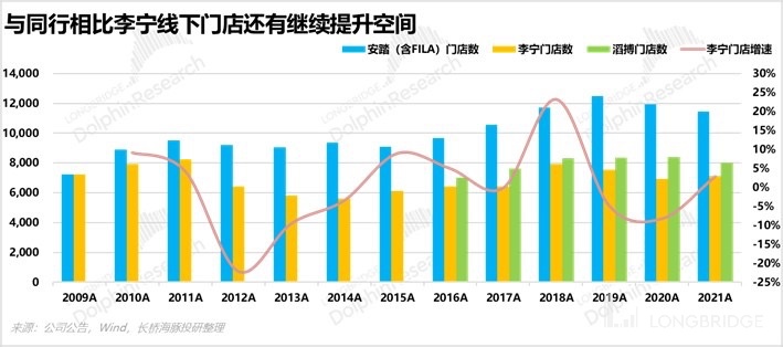 从实际情况来看,2017-2021 年,李宁品牌经销商门店增加 20%,直营店也同时减少 20%,但其占比较小,综合使得五年当中,李宁的门店总数提升仅为 10%(五年 cagr 为 2%),不过这当中确实要考虑疫情的影响。