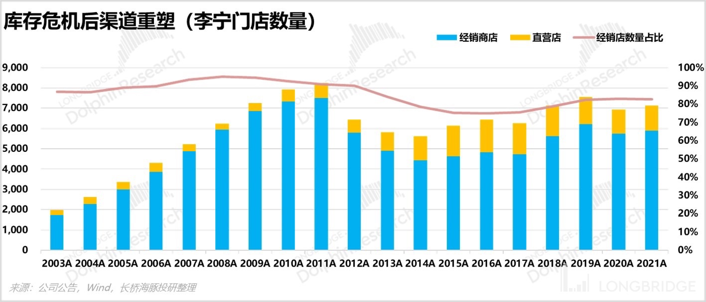 从历史上看,2011 年是李宁渠道扩张最鼎盛的时候,经销商门店数量超过 8000 家。而后便是库存危机,公司为了解决换标导致的库存积压问题,主动回收经销商的部分库存,并通过工厂店打折清理。2012 年之后更换管理层并推出 “渠道复兴计划”,对于低效的店铺加大关闭力度,并且由批发向零售转型。通过数年的清理才逐渐恢复到正常的增长轨道。