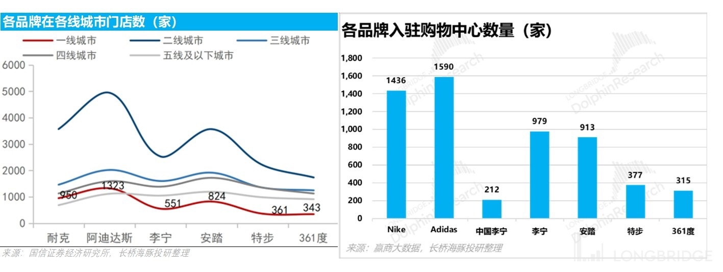 从总体门店数量来看,包含 FILA 和安踏儿童在内,安踏的门店数量已经接近 1.2 万家,但是李宁尚在七千的水平。对标行业龙头,貌似在数量上还可以有 40% 的增长,但实际当中这个比例不太可行。