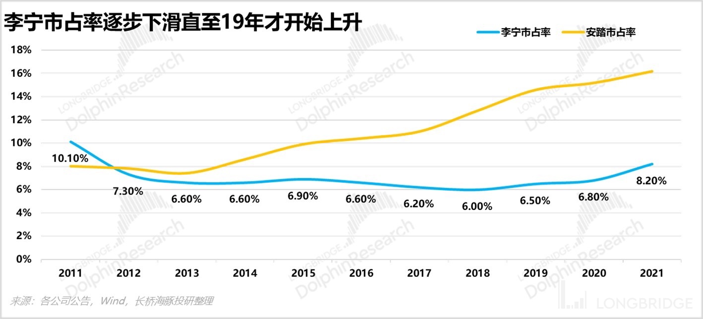 近二十年竞争格局的变化,可以说凡是李宁放弃的,皆是安踏得到的。对手高歌猛进,逐步和自己起鼓相当,此时李宁已经失去太多。
