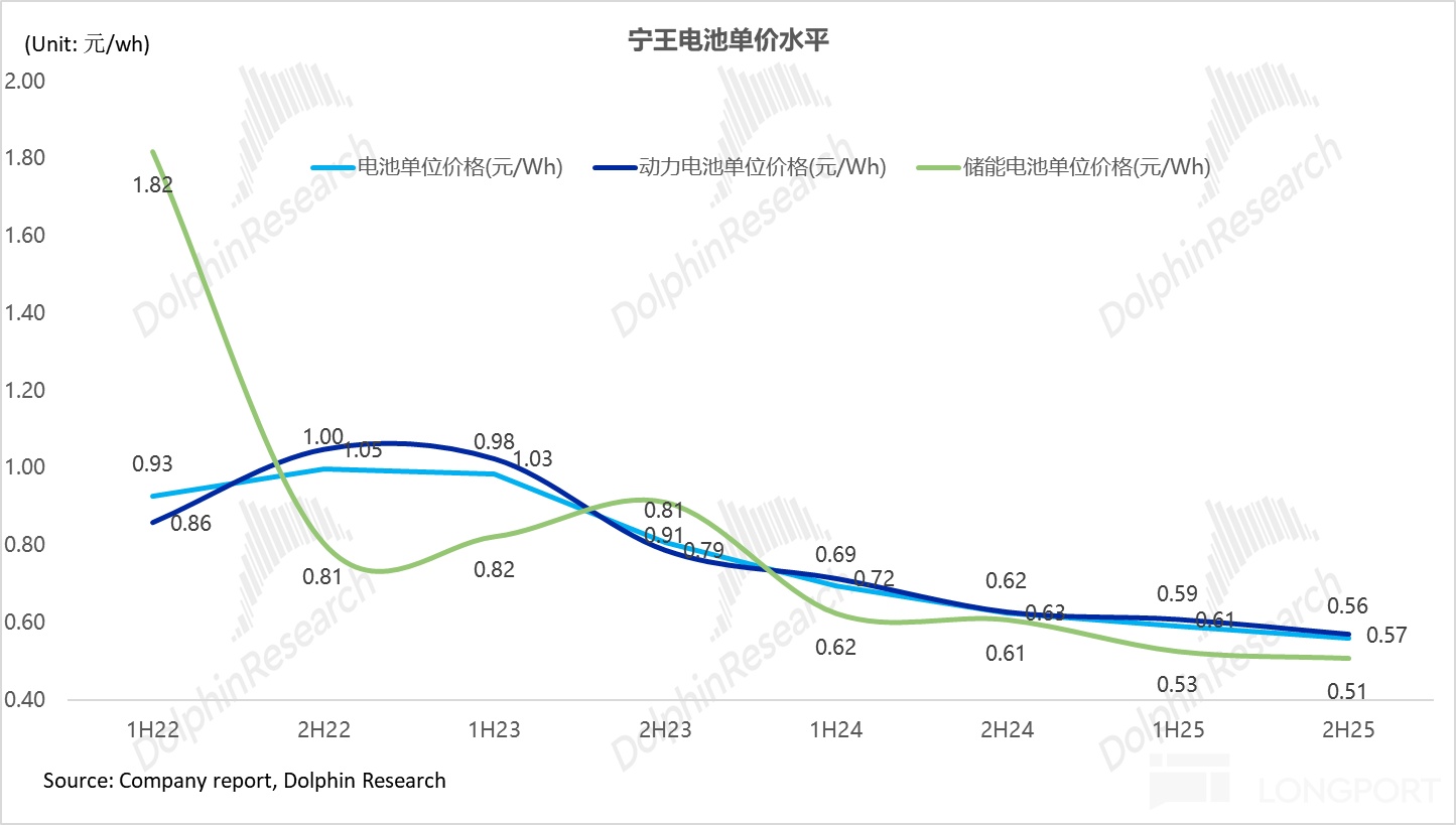 2025年下半年,宁王的境外收入占比环比下滑6个百分点至28%,海豚君认为可能由于海外的储能确收因为时间差因素占比下滑,以及国内的动力电池占比上行所致,而销量结构中低价LFP的占比预计也在上行;