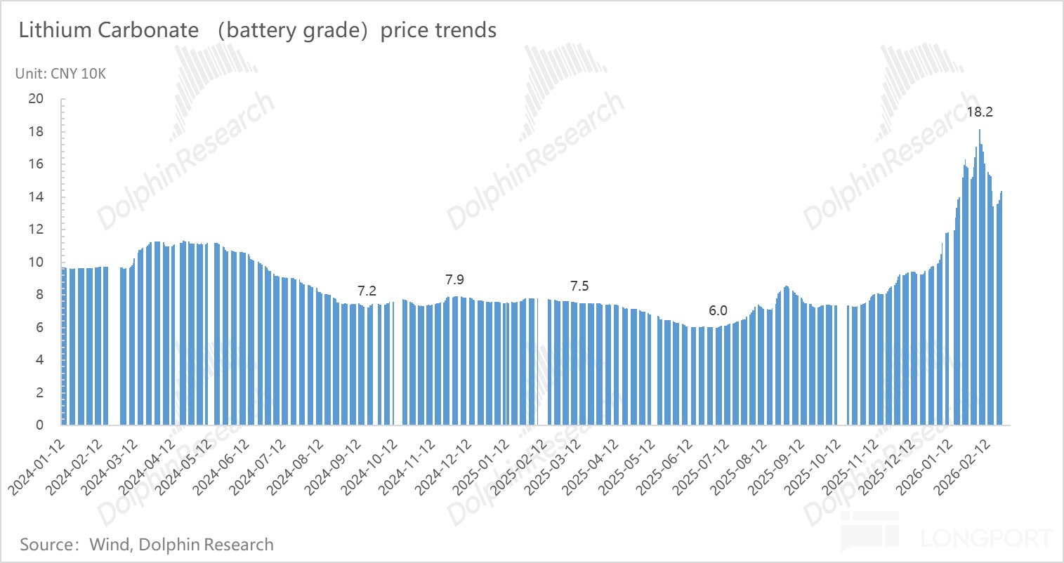 2025年Q3以来,碳酸锂、铜、电解液等核心原材料价格加速上涨,其中碳酸锂的价格2025年四季度7-8元/吨快速上涨至四季度的9-10元/吨,并在一季度加速上涨至最高点约18元/吨。