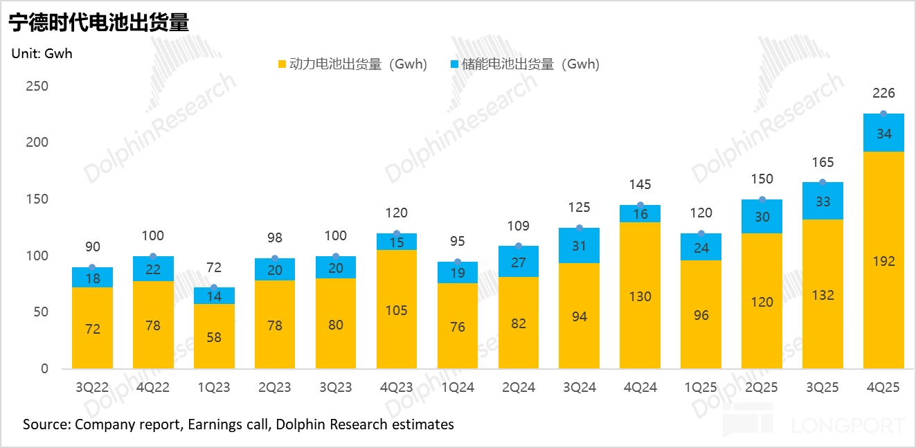2025年Q4,宁德时代在国内市场的市占率已开始环比回升(剔除比亚迪后的市占率高达56%),前期动力电池因产能瓶颈导致的份额流失问题(25年全年市占率微降1.7pct)已实质性解决,但储能电池交付量仍然受制于产能不足影响。