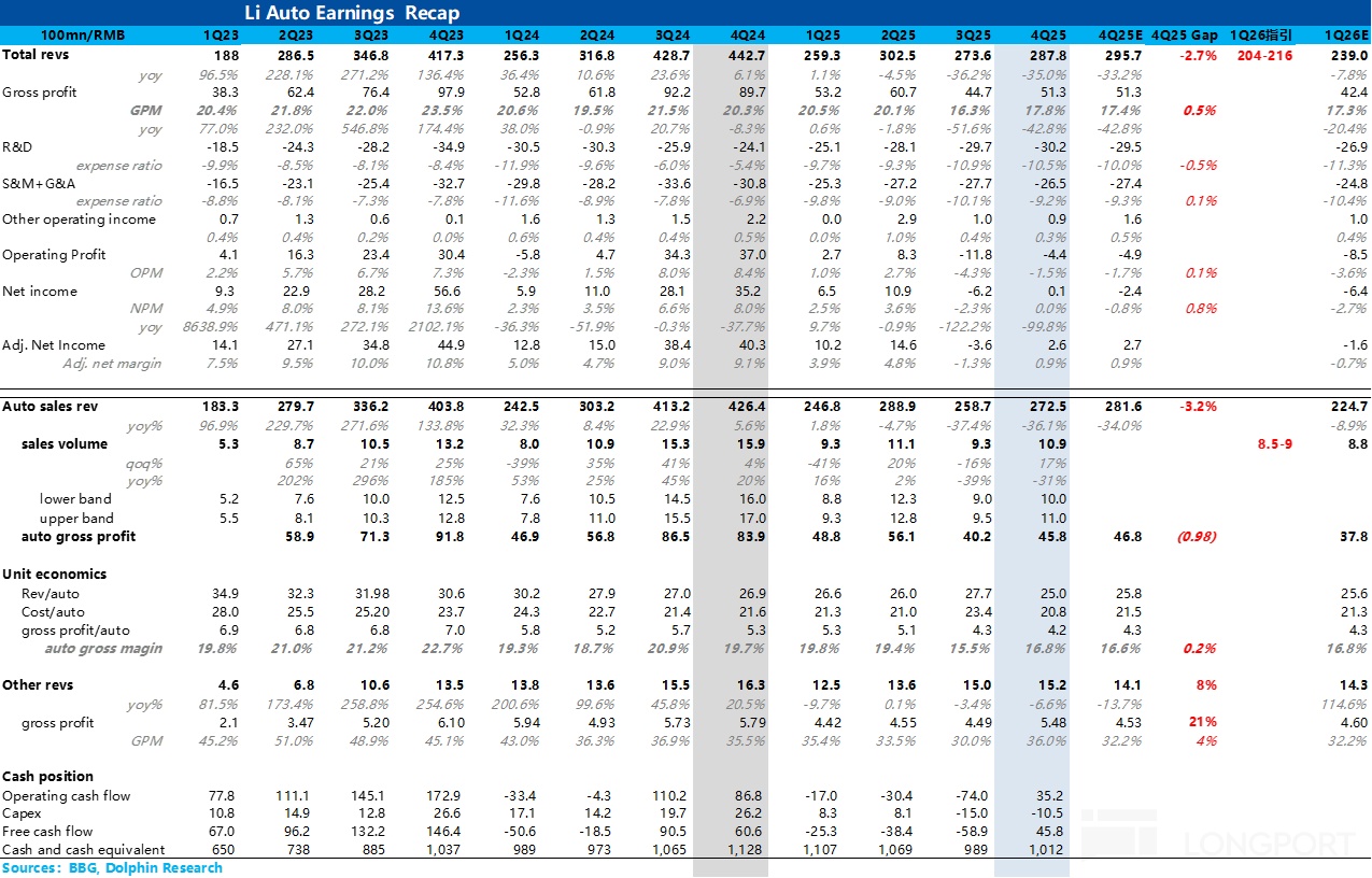 基于上述大幅下行的均价预期,以及一季度仍然相对疲软的销量(Q1销量环比25Q4下滑17%-22%,导致单车分摊的固定成本上升,规模效应减弱),再叠加近期上游锂电、存储芯片等大宗原材料涨价对BOM成本的反噬,海豚君预计理想一季度的车辆毛利率预计还要环比继续走低,低于市场预期的16.8%(25Q4水平),而具体指引仍需密切关注管理层在业绩会上的表述。