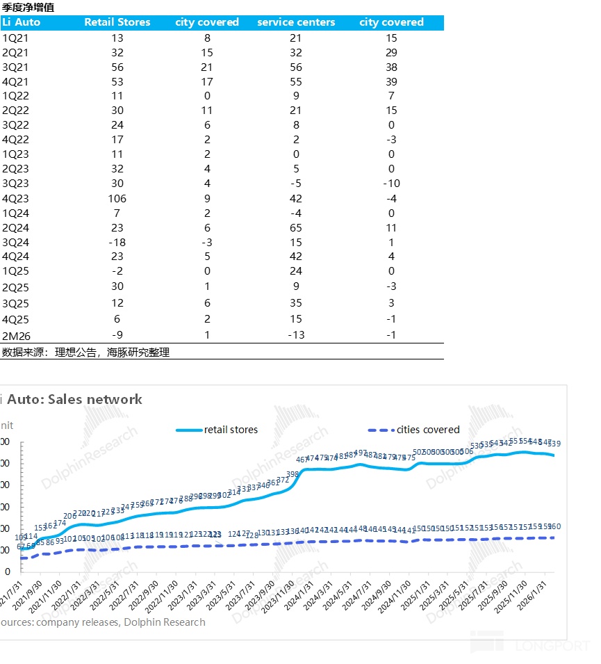 本季度销售和管理费用26.5亿,环比下滑1.2亿元,低于市场预期的27.4亿元,可能主要因为a. 四季度理想对营销部门进行了一定的裁员,营销部门合并后,直营门店一线销售淘汰 15%),缩减了薪酬开支;b. 新车上市相关的营销费用投入的减少(主要集中在三季度);c. 新增渠道铺设上,理想已经从前期的“激进扩张”转向“谨慎经营”。四季度,全国仅新增 6 家零售中心和 15 家服务中心。而进入 2026 年一季度后,理想甚至裁撤并优化部分低效门店来降低成本。