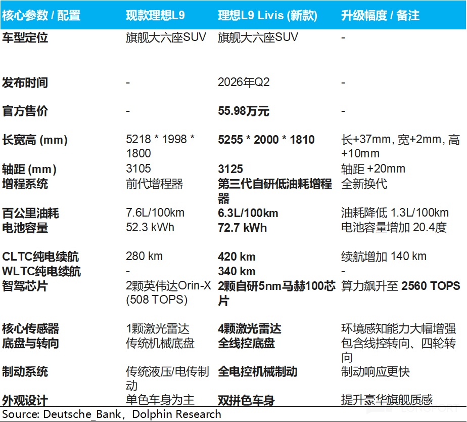① 自研算力底座即将落地: 采用 5nm 制程的自研“马赫 100(M100)”芯片即将量产落地,其单车双芯配置的有效算力高达 2560 TOPS 。该芯片将首搭于新一代旗舰 L9 Livis 车型 ,并计划在 2026 年推动 VLA 大模型的全系标配。