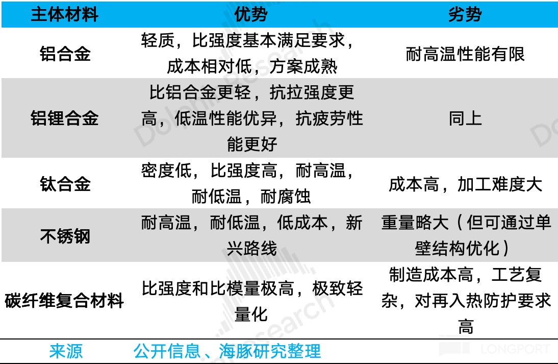 (2)箭体在火箭上成本中占比次高,材料选择是重点考量的问题