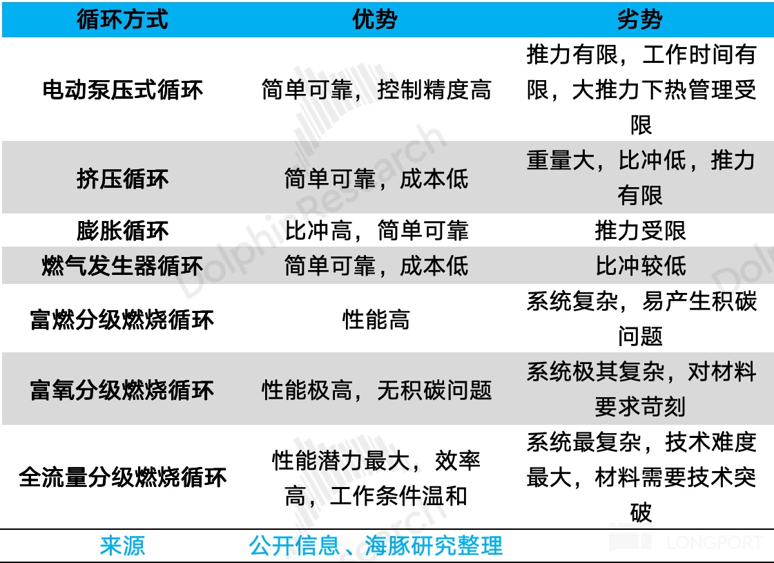 Blue Origin使用富氧分级燃烧循环,SpaceX的Merlin发动机(用于Falcon)采用燃气发生器循环,Raptor发动机(用于Starship)则采用全流量燃烧循环。
