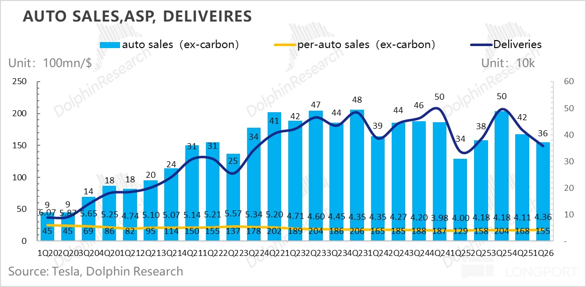 虽然一季度受中美市场政策退坡影响,实际交付量(35.8万辆)不及预期且环比下滑,但由于产品结构优化(高价的Model S/X和Cybertruck占比提升至5%)、美国等市场促销折扣力度收回,以及FSD全面转向订阅制后新增订阅数创历史新高带来的高毛利软件收入确认,卖车单价(ASP)结束了连续下跌趋势,环比大幅回升了2500美金至4.36万美元。