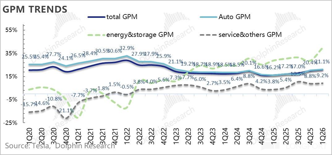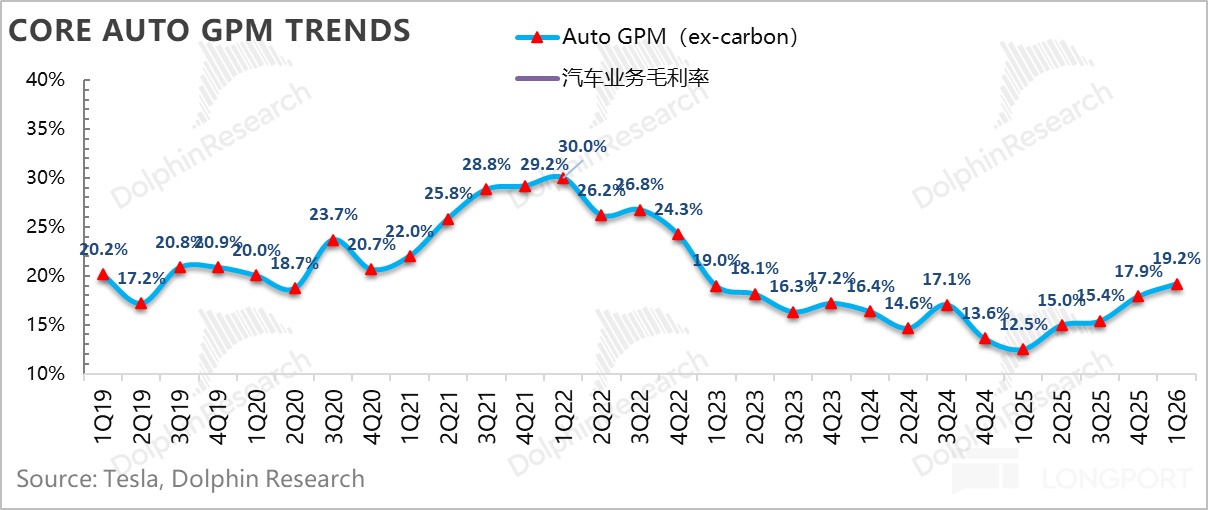 一季度汽车销售毛利率(剔碳积分和租赁)19.2%,大幅超出市场预期15.3%,环比上季度提升1.3个百分点,但正如上述所说,本季度有两项一次性因素影响(2.3亿美元 的保修准备金冲回,2亿美元 的关税相关汇兑收益),但实际核心汽车毛利率约为17.5%,仍高出市场预期的14.7%-15.3%,单车ASP的回升是主因。
