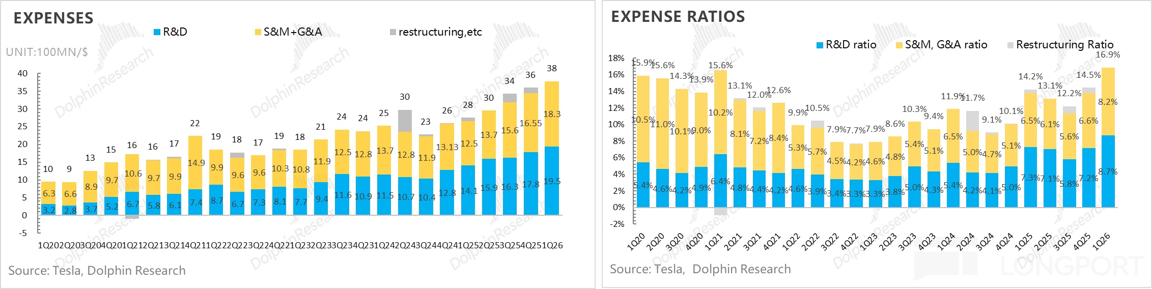 在剔除上述一次性因素后,本季度的实际核心汽车毛利率约为17.5%。虽然这一水平环比上一季度的17.9%略有下滑,但仍显著高于市场预期。海豚君认为,这主要得益于卖车单价的环比回升,高毛利的FSD收入确认增加,抵消了因销量下滑带来的单车摊销折成本上升,以及上游原材料成本上行的不利影响。