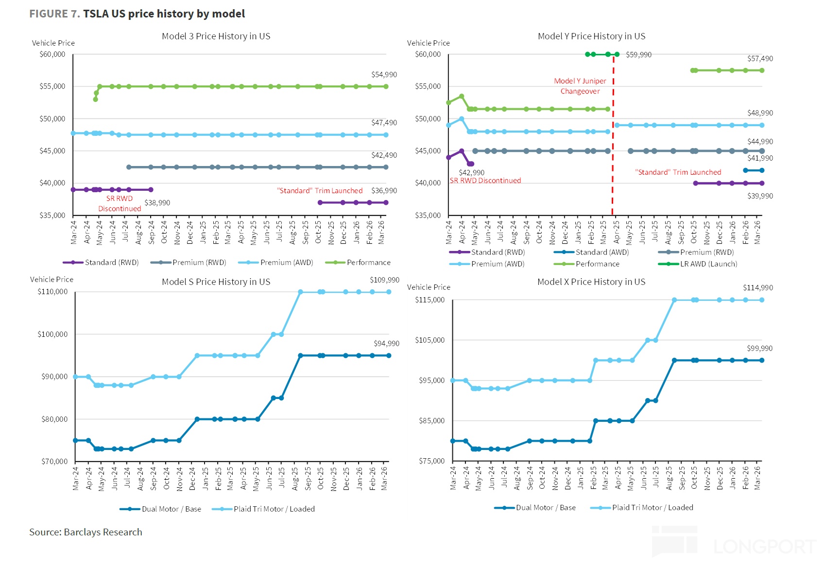 管 Model 3/Y 的官方指导价保持稳定(25Q4 已预先推出更具价格竞争力的基础版以对冲补贴退坡),但公司显著收回了去年四季度的促销力度。例如,25Q4 极具吸引力的“0 首付租赁方案”在 26Q1 正式退出,且租赁费率出现环比大幅上涨。
