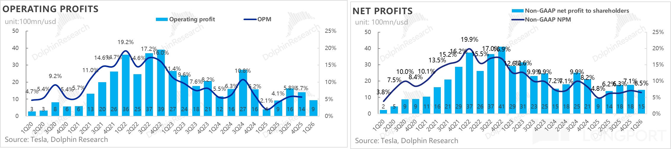⑤ 经营利润超预期:最后即使因为AI投入带来的研发费用上升,以及SBC费用(主要系CEO绩效奖励)上行导致的销管费用(18.3亿)增加,但在整体收入超预期、核心卖车ASP回升叠加储能与服务业务高毛利的带动下,本季度经营利润达到9.4亿美元,大幅高于市场预期的3.6亿美元;经营利润率达到8.2%,环比逆势上行了1.6个百分点。