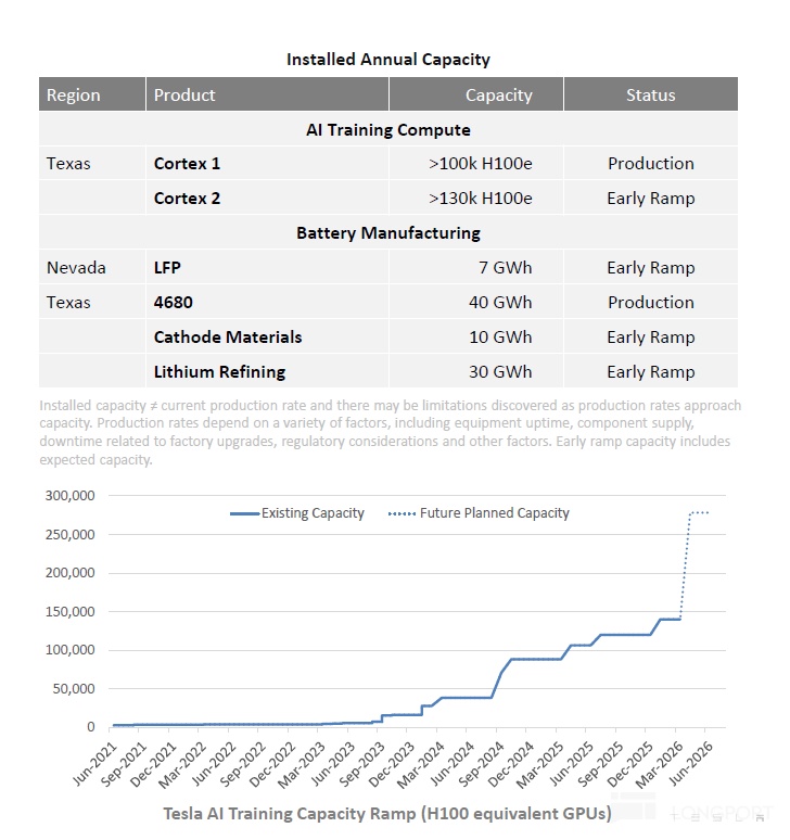 公司已将2026年资本开支指引从之前的“超过200亿美元”大幅上调至“超过250亿美元”,主要用于支持六大新工厂(包括锂精炼厂、Cybercab、Optimus等)及AI计算基础设施的建设。