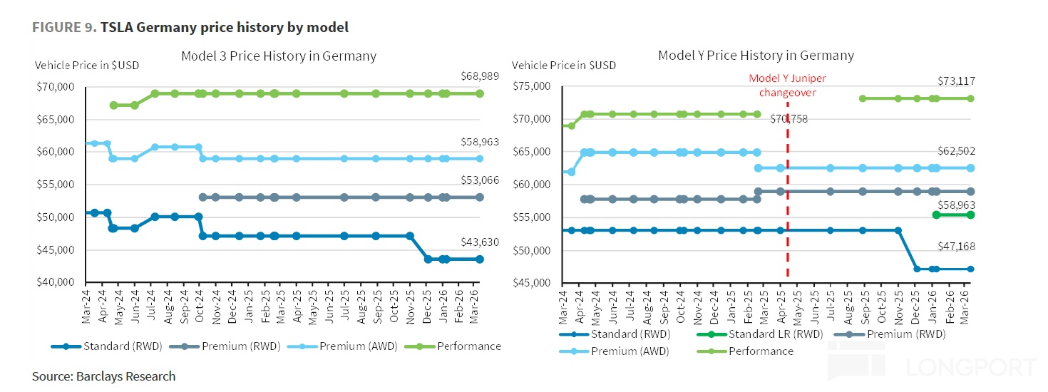 一季度,特斯拉在欧洲市场Model 3/Y的标准版价格延续去年四季度的下调,且部分市场提供长达 5年期的 0% 利率贷款。在当前欧洲高息环境下,免息政策相当于变相为消费者省下了购车成本。