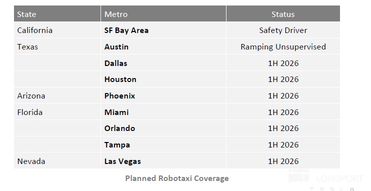 a. 区域扩张稳健:Robotaxi已向达拉斯和休斯顿拓展,目标年底前在十余个州实现无监督运营。