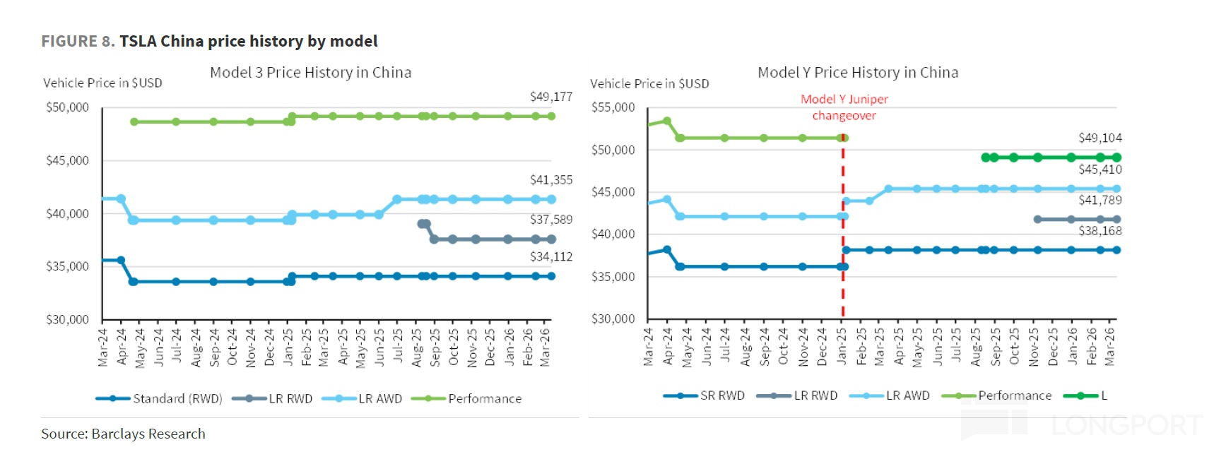 中国补贴力度环比提升,很大程度上是为了对冲新能源汽车购置补贴退坡后车辆成本上升的影响。特斯拉在一季度几乎整段时间推出 Model 3/Y 全新的 7 年期超低息贷款政策,并延续了 2025 年四季度推出的 5 年期 0 息金融方案,同时还推出车漆优惠、库存车折扣等其他补贴;