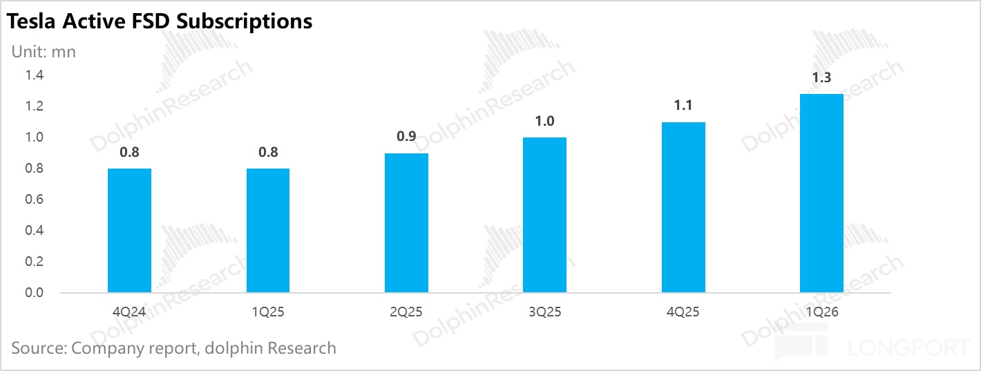 d. FSD订阅数:FSD 目前全球付费客户已接近 130 万 。自 2026年2月15日 起,特斯拉在全球范围内取消了FSD的一次性购买选项,全面转向月度订阅制(当前价格为99美元/月),而该政策推动了订阅用户成为增长的绝对主力。